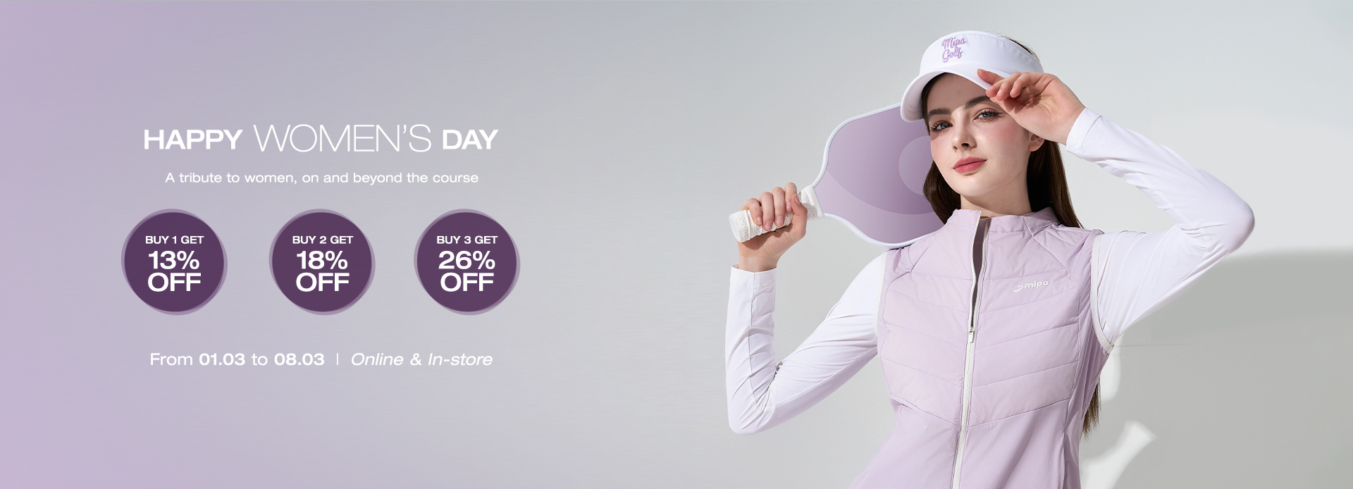 Phụ nữ chính là những bông hoa đẹp nhất, luôn tỏa sáng theo cách riêng của mình. Nhân dịp Ngày Quốc tế Phụ nữ 8/3, Mipa Golf trân trọng gửi đến phái đẹp những ưu đãi và món quà đầy ý nghĩa, như một lời tri ân chân thành dành cho sự mạnh mẽ, dịu dàng và tỏa sáng của bạn.